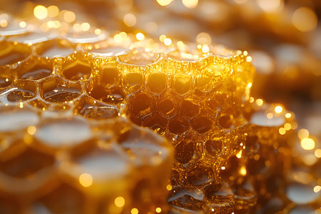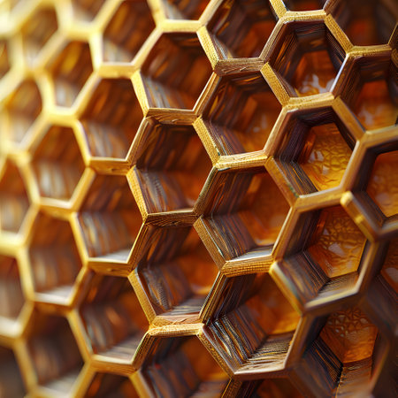 Detailed view of honeycomb structure, showcasing the hexagonal cells. Golden color and texture are prominent.