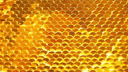 Luxury golden Background. Abstract Texture scales with gold Sequins close-up. Glamor Background with shiny Sequins on fabric, macro. Abstract background with gold sequins color on the fabric.