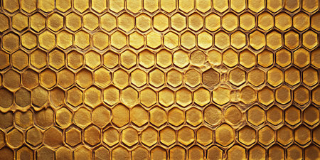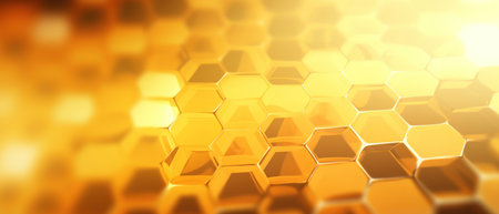Stylized golden Honeycomb pattern with honey. Hexagonal Beeswax structure. Concept of apiculture, beekeeping, honey production, artistic design. Digital art. Abstract background. Copy space. Banner