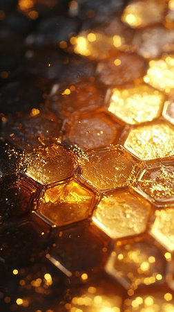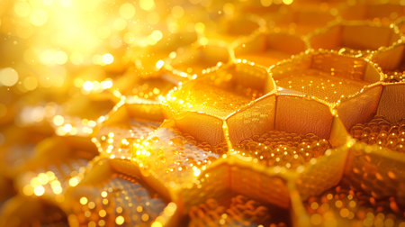 Honeybees flying around hexagon honeycomb cells, producing honey with golden light. Busy bees working on honeycomb bathed in golden sunlight