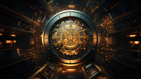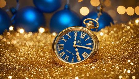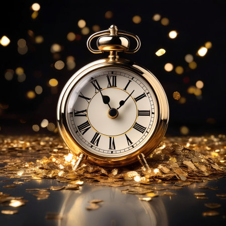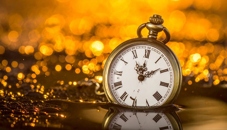 A golden vintage clock nearing midnight, surrounded by sparkling bokeh lights, representing the countdown to New Year's Eve celebrations.