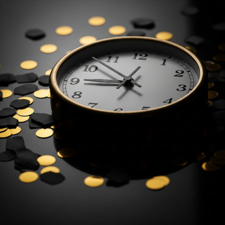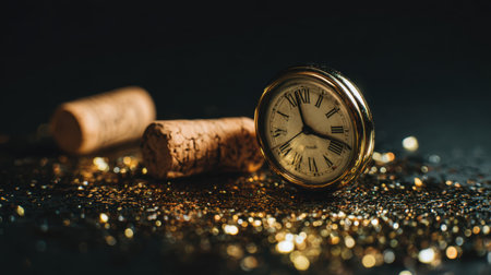 Stunning close-up of an antique clock with Roman numerals, paired with wine corks and glittering gold particles, creating a luxurious and festive atmosphere.