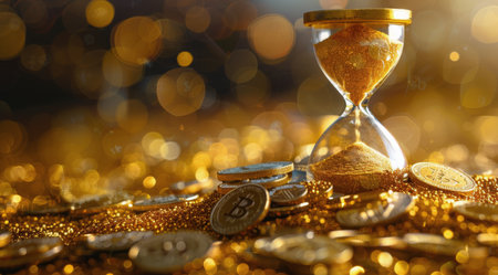 A gold hourglass sits atop a pile of gold coins, with a bokeh effect in the background.