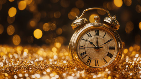 A vintage alarm clock exhibits elegance against a sparkling gold background with bokeh effects. Perfect for themes of time, celebration, or nostalgia.