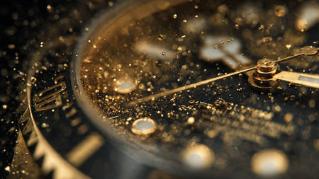 Detailed view of watch with golden specks, water droplets, and blurred background