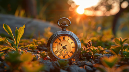 A classic pocket watch sits among greenery, capturing the essence of time with a glowing sunset in the background. Symbolizes nostalgia, the passage of time, and tranquility.