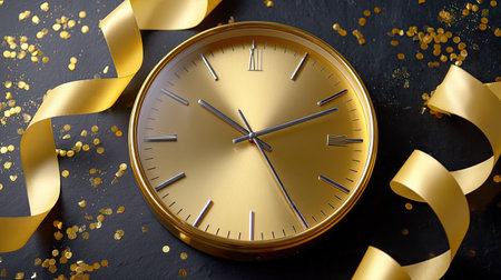 A luxurious gold clock rests elegantly against a dark backdrop, surrounded by sparkling golden confetti and flowing ribbons, perfect for celebratory themes.