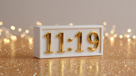 A stylish gold-tone clock displaying 11:19 set against a shimmering gold background, creating a dreamy ambiance perfect for home decor or festive celebrations.