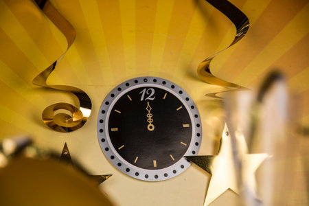 New Year's clock and Christmas decorations on a golden background. Selective focus.