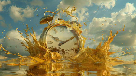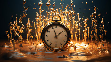 Surreal illustration of a melting golden and mercury clock, fluid and distorted, depicting the illusion of time