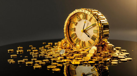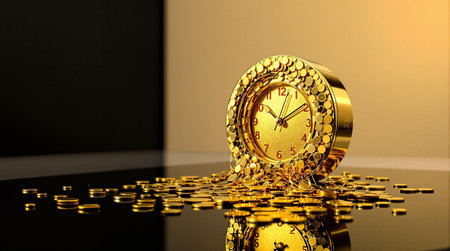 Time is money: golden clock overflowing with coins symbolizing wealth.