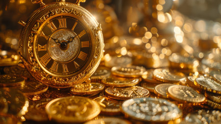 This captivating image features a golden clock surrounded by shimmering coins, evoking a sense of luxury and wealth. The radiant light reflections enhance the intricate details, making it a stunning visual piece perfect for themes of opulence and time.