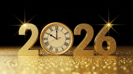The year 2026 rendered in shiny gold numbers with a vintage clock showing midnight approaching. The scene is set on a glittering surface against a dark background.