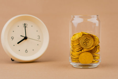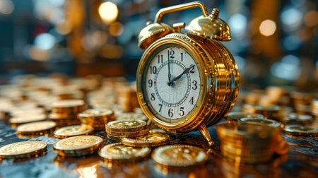 A vintage golden alarm clock surrounded by stacks of coins, illustrating the concept of time and money.