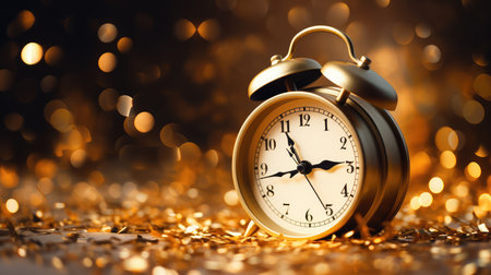 A vintage alarm clock with confetti scattered around, set against an elegant background of bokeh lights and soft focus. The golden hues create a warm atmosphere, while delicate glittering sparkles add to the festive ambiance. This image is perfect for evoking a nostalgic New Year's Eve celebration or adding timeless charm to any project that captures the holiday spirit. --ar 71:30 --v 6.1 Job ID: ec16bd33-6861-415c-a57d-8a8dc1ddac3a
