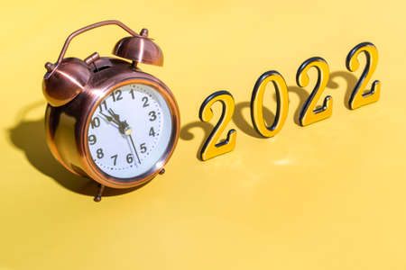 Alarm clock and numbers 2022 with hard shadow on yellow background. New year celebration minimal concept. Close up. copy space