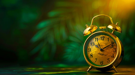 Golden alarm clock on a table with green leaves.
