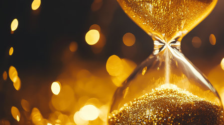 Golden sand trickles through the hourglass, symbolizing the passage of time in a warm, enchanting atmosphere.