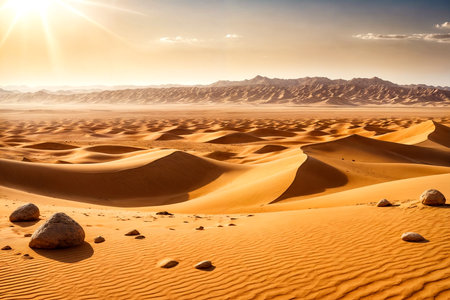 desert with rising sun, casting warm light and shadows onto the landscape, created with generative ai