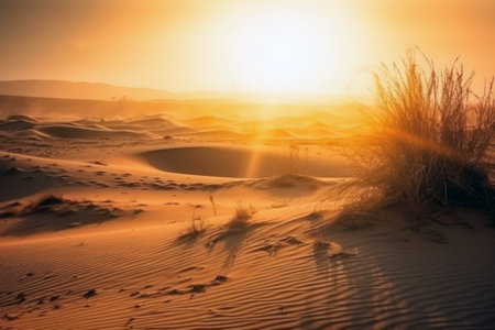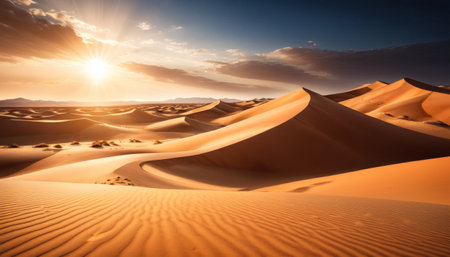 A sunset over a desert landscape with sand dunes created with Generative AI