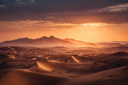 A stunning sunset over a desert landscape with sand dunes and rugged mountains created with Generative AI