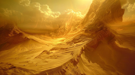 Defocused view of rippling sand dunes amidst a hazy miragelike atmosphere in the desert.