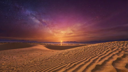 AI Generated. a nighttime desert scene with a sky full of stars and moonlit sand dunes