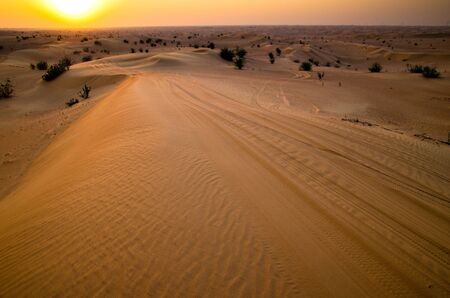 Desert at sunset. Golden wavy sand dunes in Dubai.