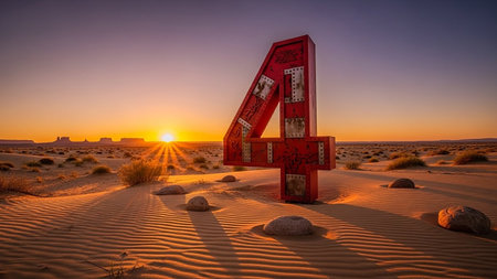 A giant red letter A stands in the desert sand as the sun sets behind it, casting a warm glow.
