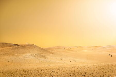 Panorama of landscape Sahara desert, sand mountains and stones sunny day. View of expanses of desert hills with sand, vegetation and blue sky, Sahara, Tozeur city, Tunisia, Africa. Copy ad text space