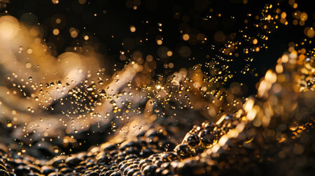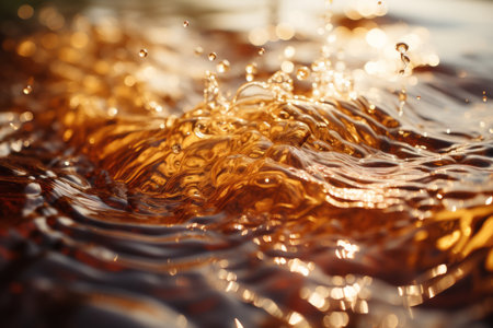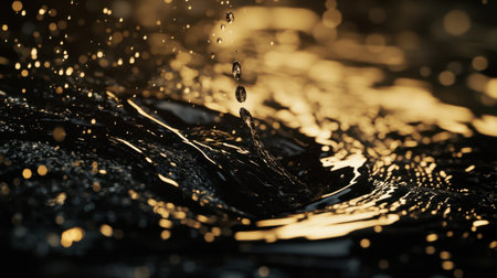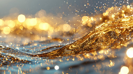 Close-up of golden liquid splashing. Ideal for abstract, liquid, and fluid themes.