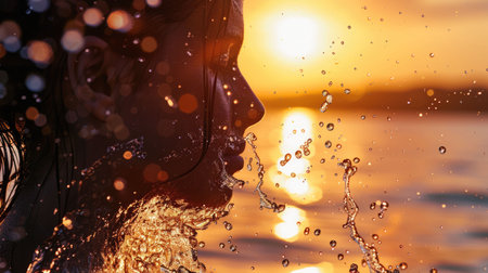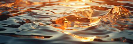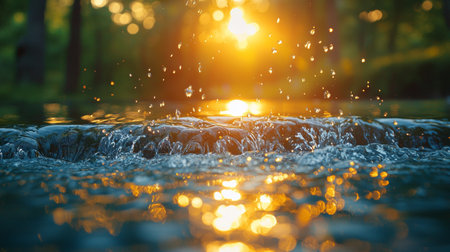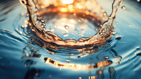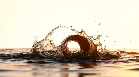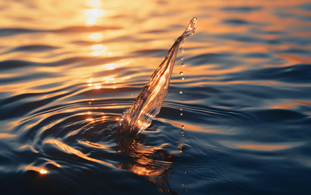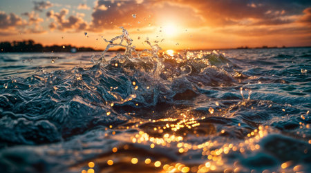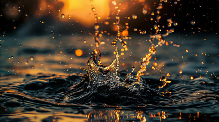 A close-up of water splashing with golden reflections during sunset, capturing a dramatic and serene moment. Perfect for themes of nature, calm, and tranquility.