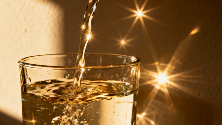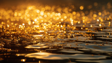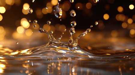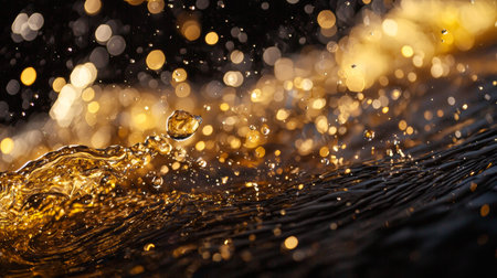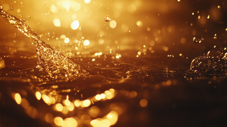 A stunning scene with golden bokeh lights and water splashes, capturing the magical interplay of light and water droplets.