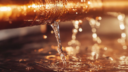 Water streams gracefully from a tap, creating a captivating display of sparkling droplets with blurred reflections dancing on a serene surface, evoking tranquility.
