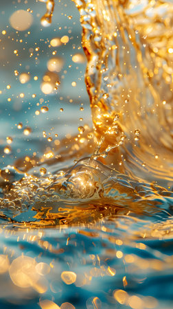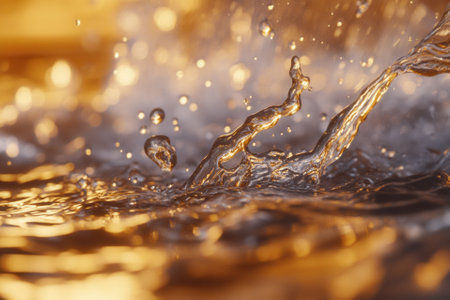 A stunning golden water splash captures the essence of sunlight, creating a warm and inviting atmosphere. Perfect for nature and beauty themes.
