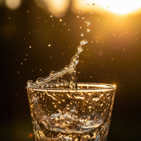 Warm sunset glow illuminates a glass as a powerful burst of water creates an energetic splash, capturing motion and serenity in harmony.
