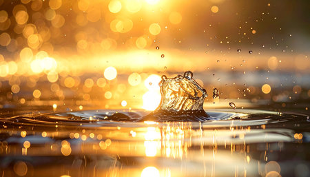 A splash of water captured in golden light during sunset, creating a dynamic and vibrant scene with shimmering reflections.