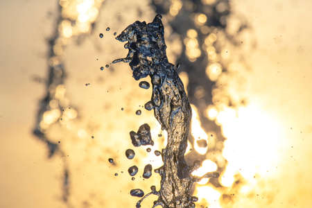 Falling drops of water in sunlight. Splash effect after falling drops collide with the water surface