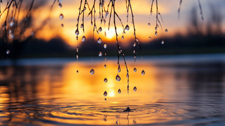 Rain-soaked willow branches dripping water, reflecting the warm hues of sunset, tranquil riverbank generative ai