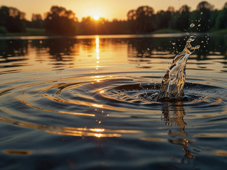 A mesmerizing close-up of a water splash captured during sunset, showcasing radiant droplets and golden reflections over a tranquil lake surface.