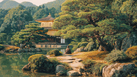 A peaceful garden features lush greenery and a traditional temple reflecting on the calm lake. A person sits quietly enjoying the serene surroundings during sunset.