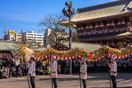 tokyo, japan - march 18 2020: Japanese puppet masters holding a huge golden dragon for the traditional dance festival dedicated to the bodhisattva Kannon in the Sensoji temple of Asakusa.