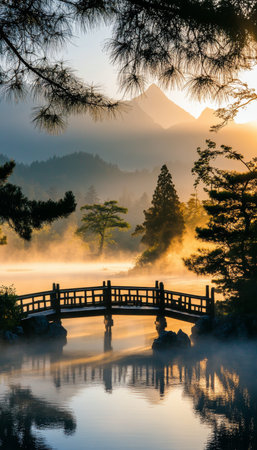 Stunning sunrise over misty lake with wooden bridge in serene chinese garden landscape