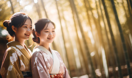 Two Japanese girls in kimono walking in a bamboo grove