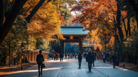 A tranquil scene of Tokyo's Meiji Shrine, framed by maple trees ablaze with autumn colors. Visitors, both locals and tourists, walk along the peaceful pathways