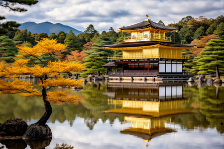 Kinkaku-ji temple golden pavilion, Golden Pavilion garden in Kyoto, Rokuon-ji zen buddhist temple, autumn fall view, with reflection in a pond, travel to Japan