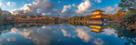 A radiant gold-covered temple sits beside a tranquil pond, surrounded by colorful autumn trees. A Japanese heritage site showing traditional architecture, serene landscape, and contemplative beauty.