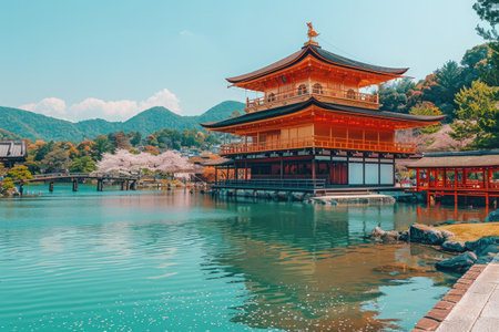 A stunning view of a traditional pagoda reflects on a tranquil lake, framed by cherry blossoms in Kyoto.