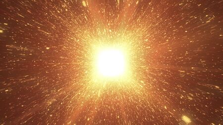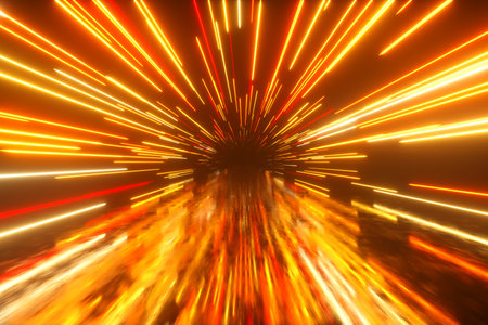 Flying in space with luminous neon lines. Hyperspace. Modern spectrum of light. Fire orange color. 3d illustration