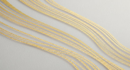 Diagonally showing a cascade of fine, shimmering golden threads or strands flowing diagonally against a white background, with bright sparkling highlights scattered...